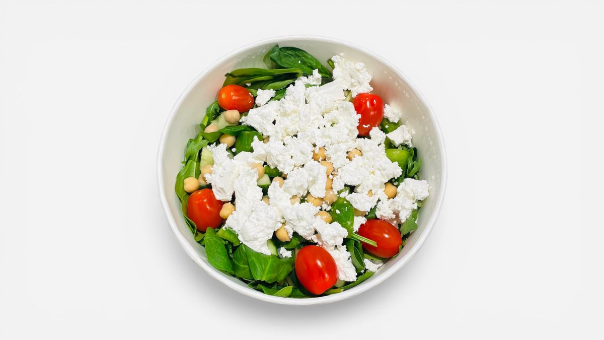 Greek horiatiki salad + valitsemasi jogurtti ja patukka. Salaatissa kastikkeena oliiviöljy ja viinietikka.