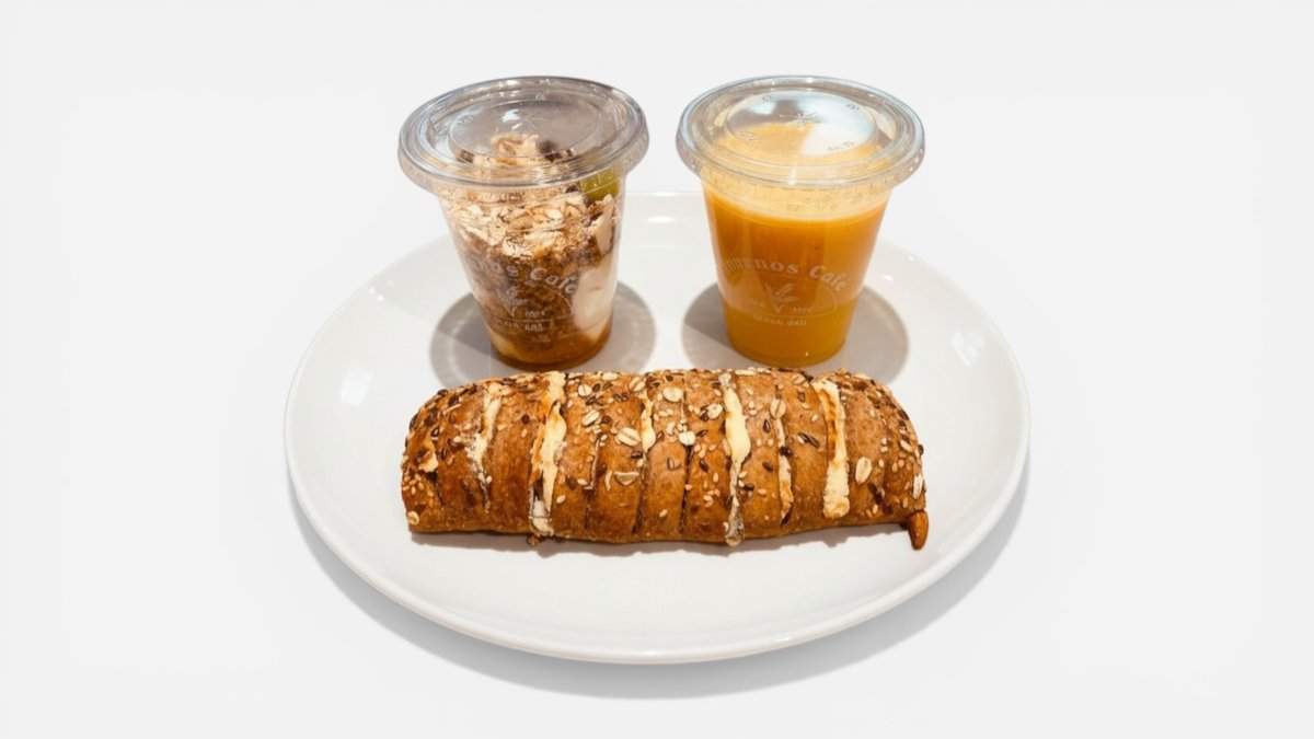 Täysjyväpiiras kalkkuna-tuorejuusto + valitsemasi jogurtti + tuorepuristettu appelsiinimehu.