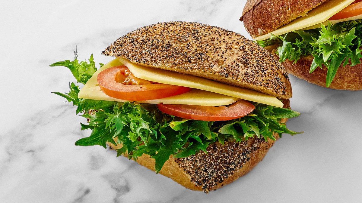 Hapanjuuri siemensämpylän täytteenä tuoretta salaattia, tomaattia ja cheddar-juustoa. Laktoositon.