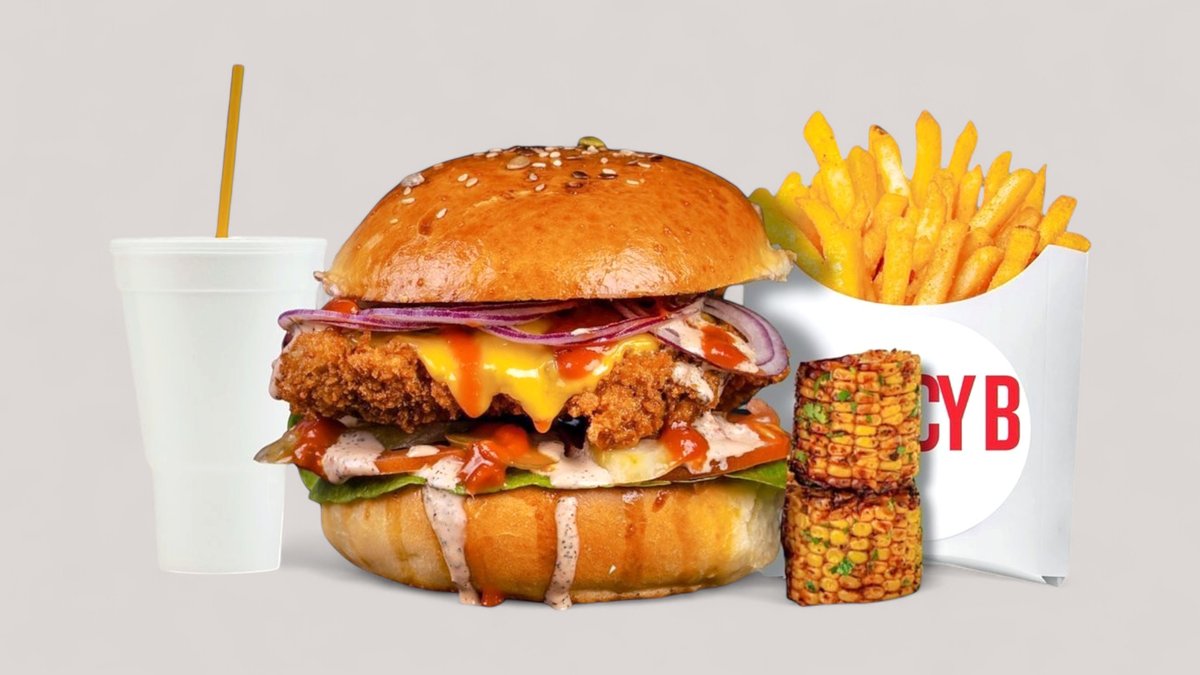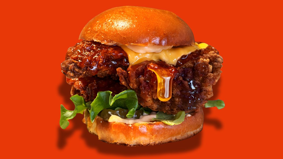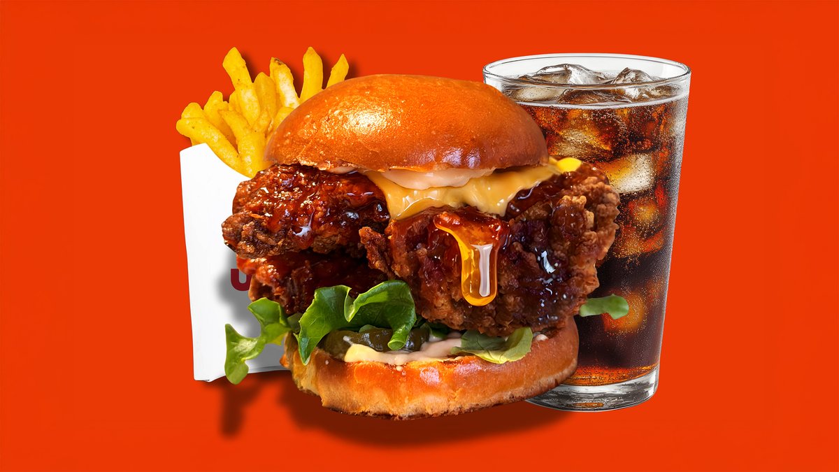 HOT HONEY Nashville and KOREAN bbq burgers with soft buns, crispy chicken glazed in our house sauces and spice blend, layered with salad, and hot mayo. Served with crispy fries, a refreshing drink, and a tasty dip.