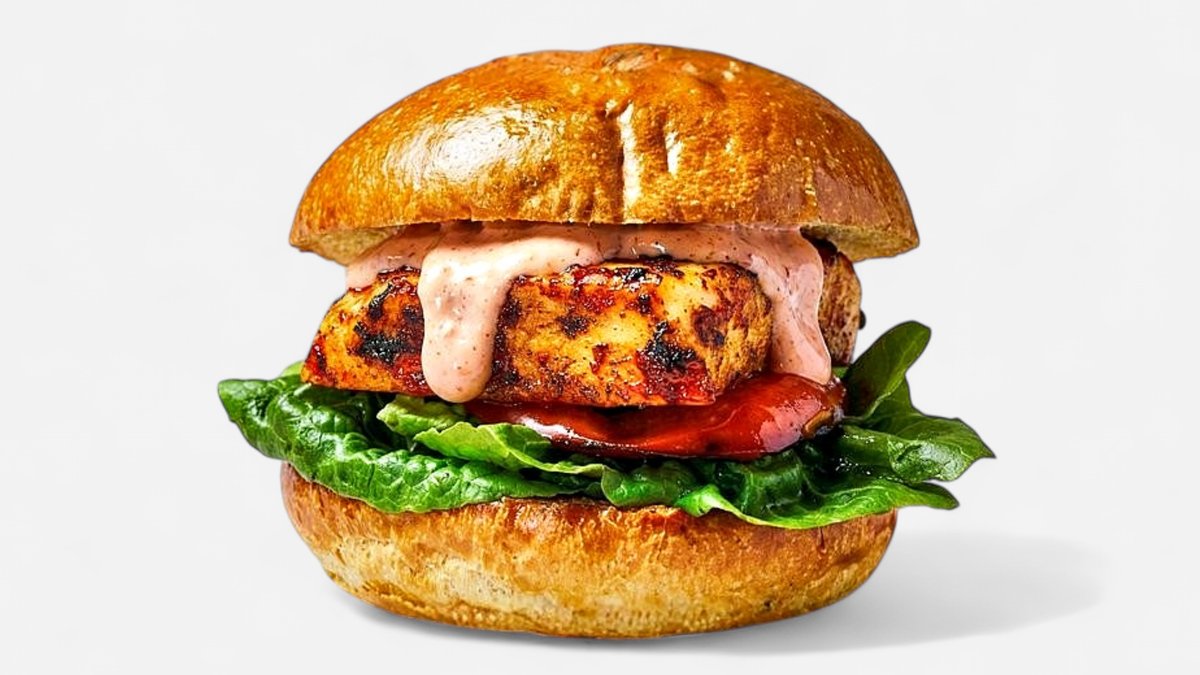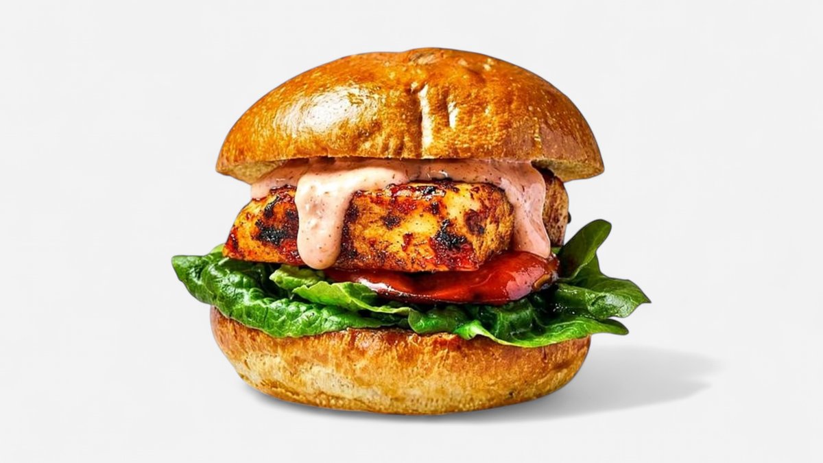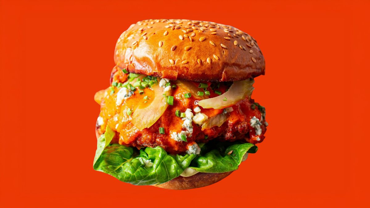 Crispy fried chicken drenched in Buffalo sauce, layered with tangy blue cheese crumbles, fresh green lettuce, and juicy pineapple pieces —all packed in a soft, toasted brioche bun. A perfect balance of heat, tang, and creamy indulgence.