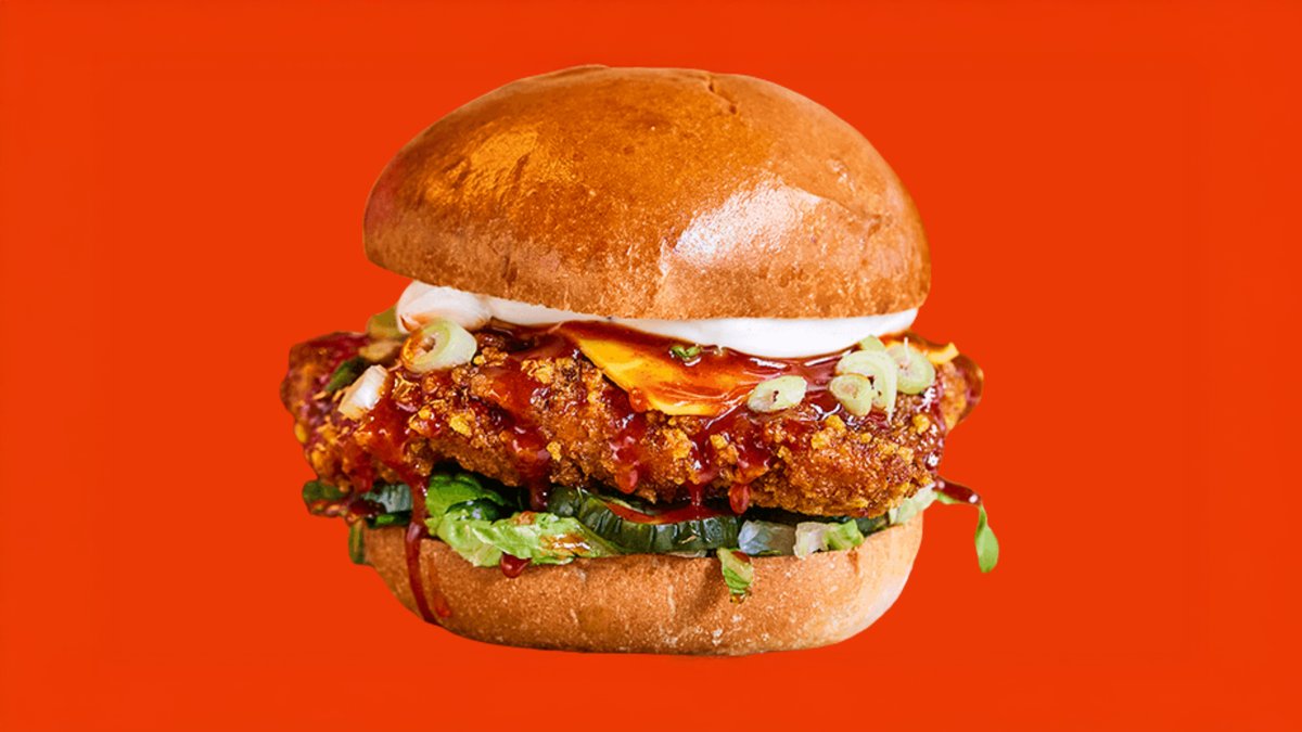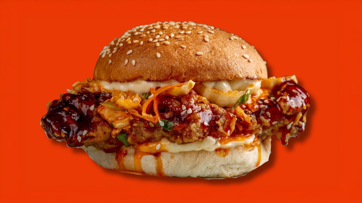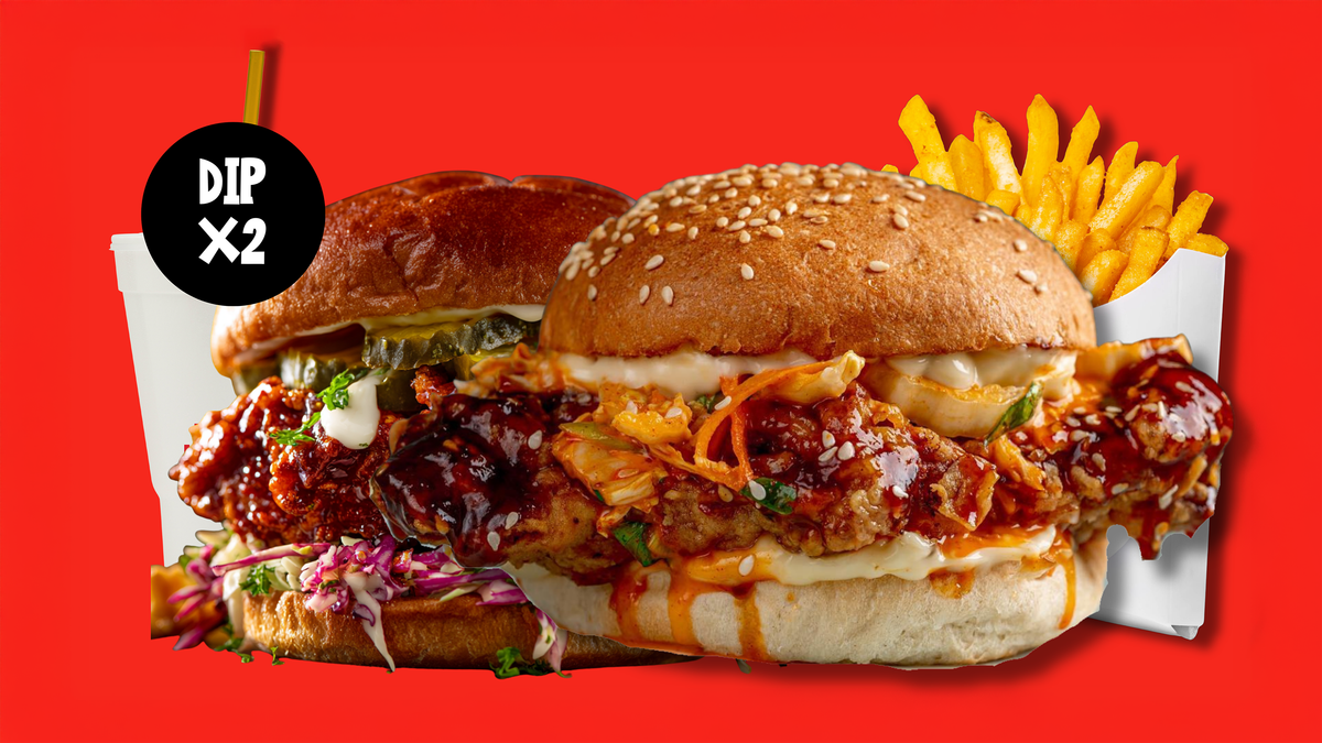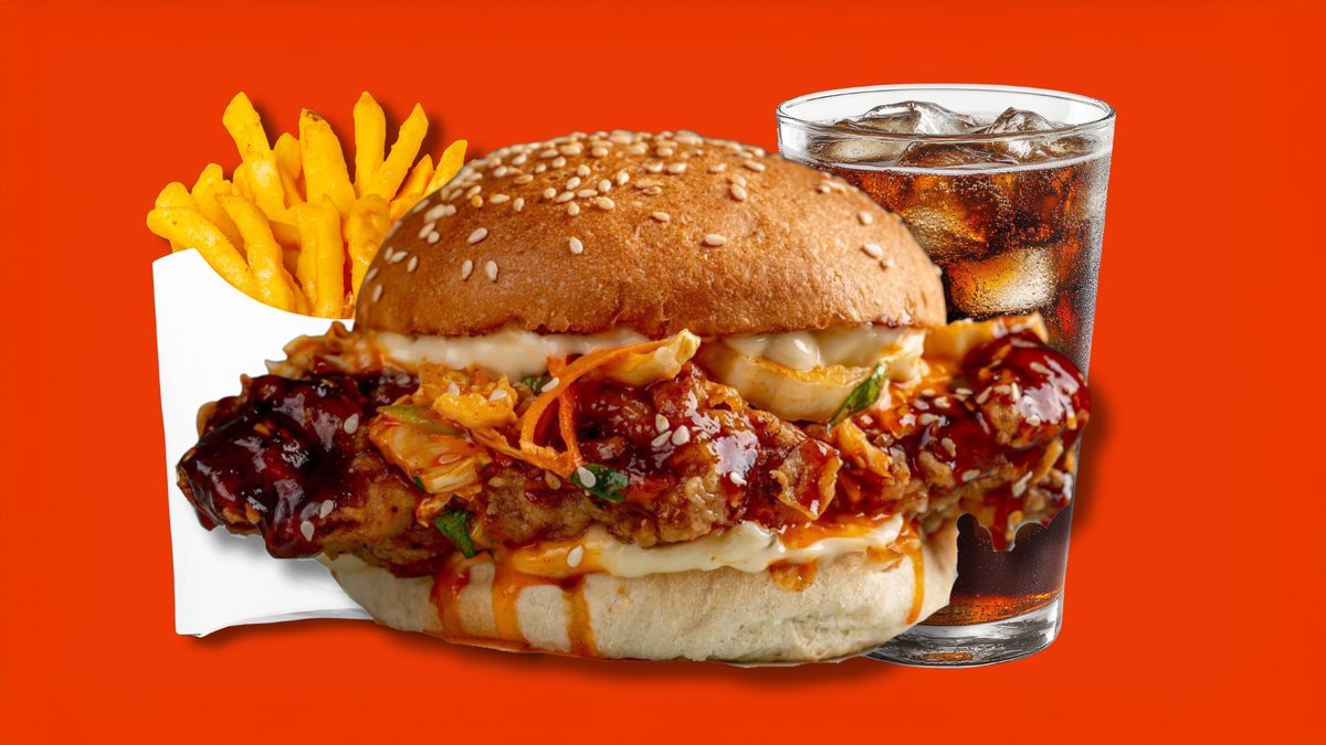 Crispy chicken burger with blazing Korean chili sauce. Served with fries, dip & drink.