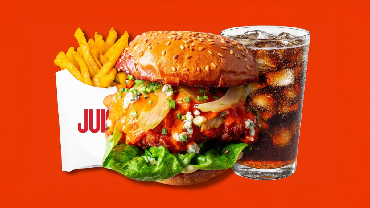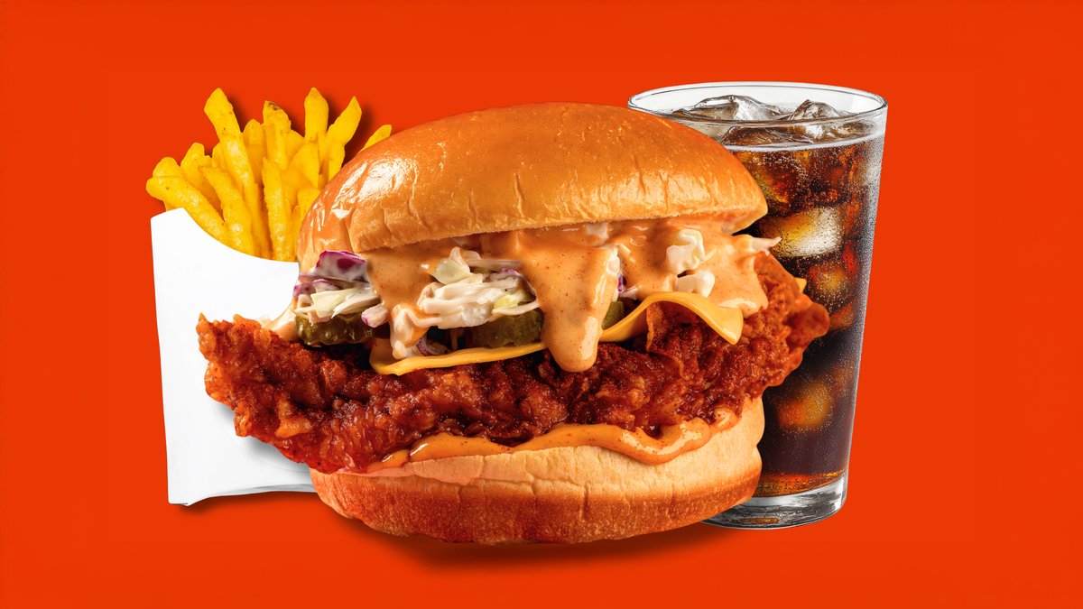 Crispy Nashville hot chicken burger with bold spice. Served with fries, dip & drink.