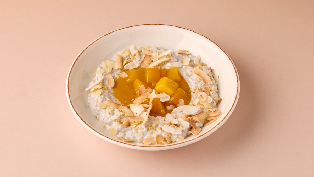 Kookos-mango chiavanukas, mangoa, mantelia ja paahdettuja kookoslastuja (V, G) Coconut chia pudding with mango chunks, almond and roasted coconut flakes (V, G)