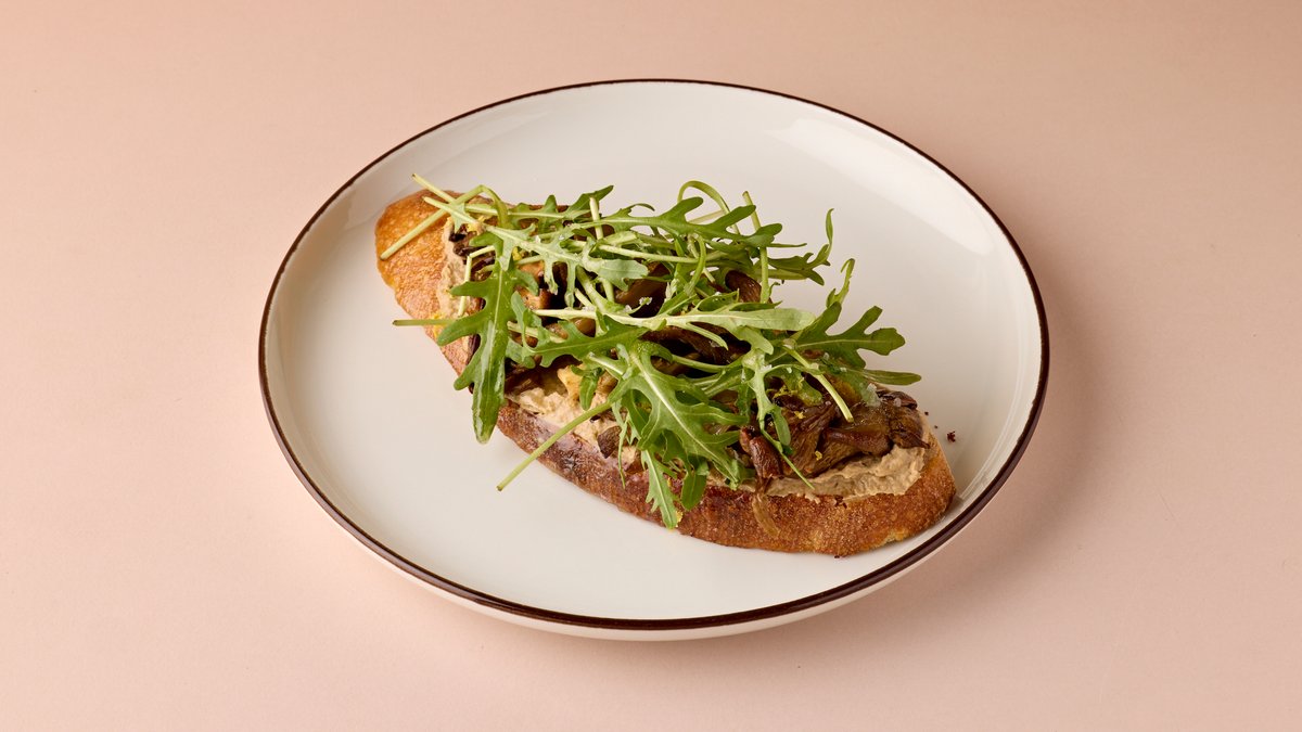 Paahdettua levainleipää, musta valkosipuli- hummusta, osterivinokkaita, sitruunankuorta, rucolaa (V, pyydettäessä G) Toasted sourdough bread, black garlic hummus, fried oyster mushrooms, lemon zest, rucola (V, ask for G)