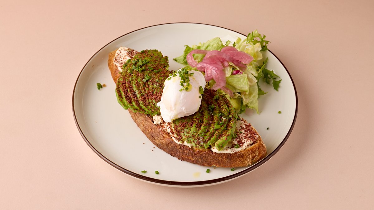 Paahdettua levainleipää, seesamilevite, avocadoa uppomuna, sumakkia, ruohosipulia (L, pyytäessä G) Toasted Sourdough bread, sesame spread, avocado, poached egg, sumac, chives (L, ask for G)
