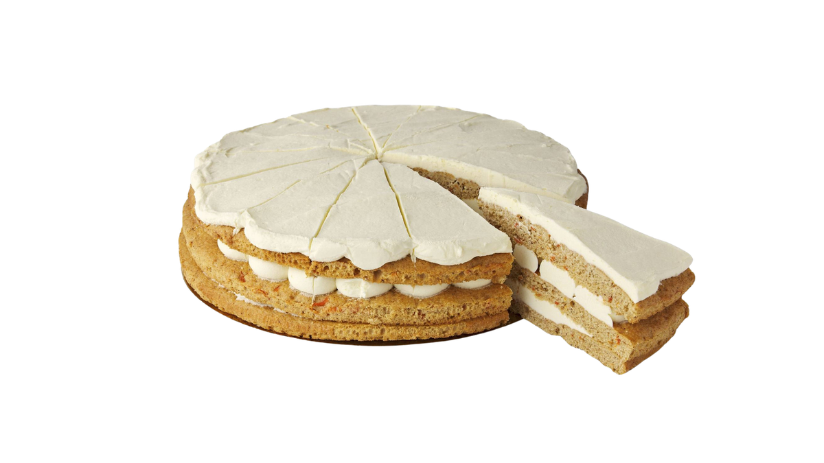 Mehevä porkkanakakku useassa kerroksessa, eli enemmän myös kuorrutetta. Tästä ei porkkanakakku parane.. Kakku on leikattu valmiiksi 14 palaan.