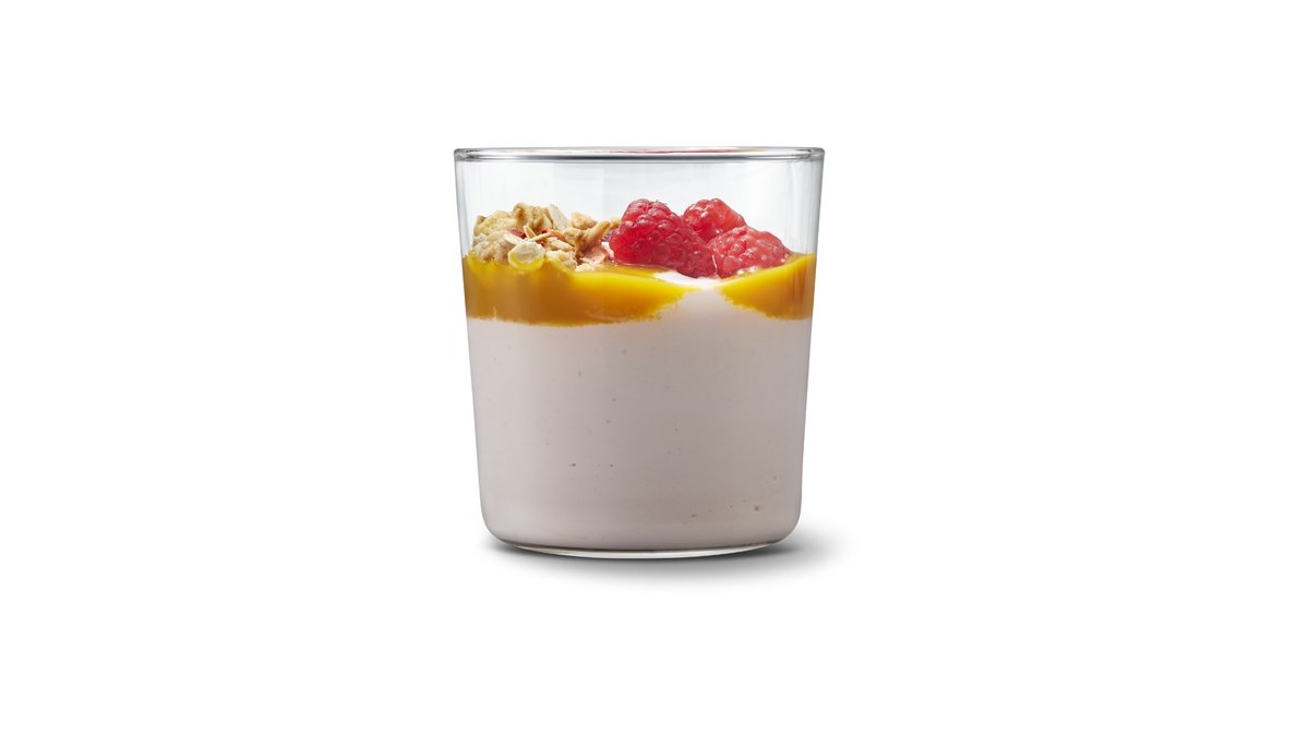Pehmeää vadelmajogurttia, mangopyrettä, vadelmia sekä granolaa
