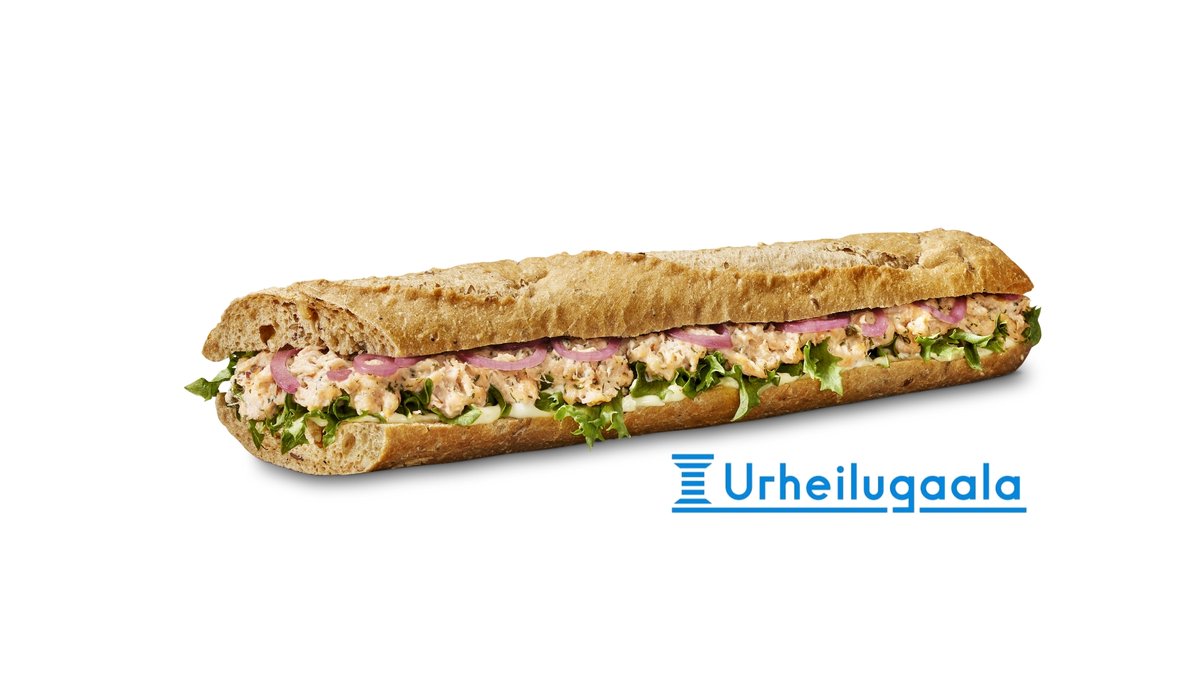 Urheilugaalan virallinen kisakatsomopatonki! Rapeassa 6-viljan patongissa lämminsavukirjolohitahnaa (Suomi/Ruotsi/Norja), Picnic-remouladekastiketta, pikkelöityä punasipulia sekä salaattia.