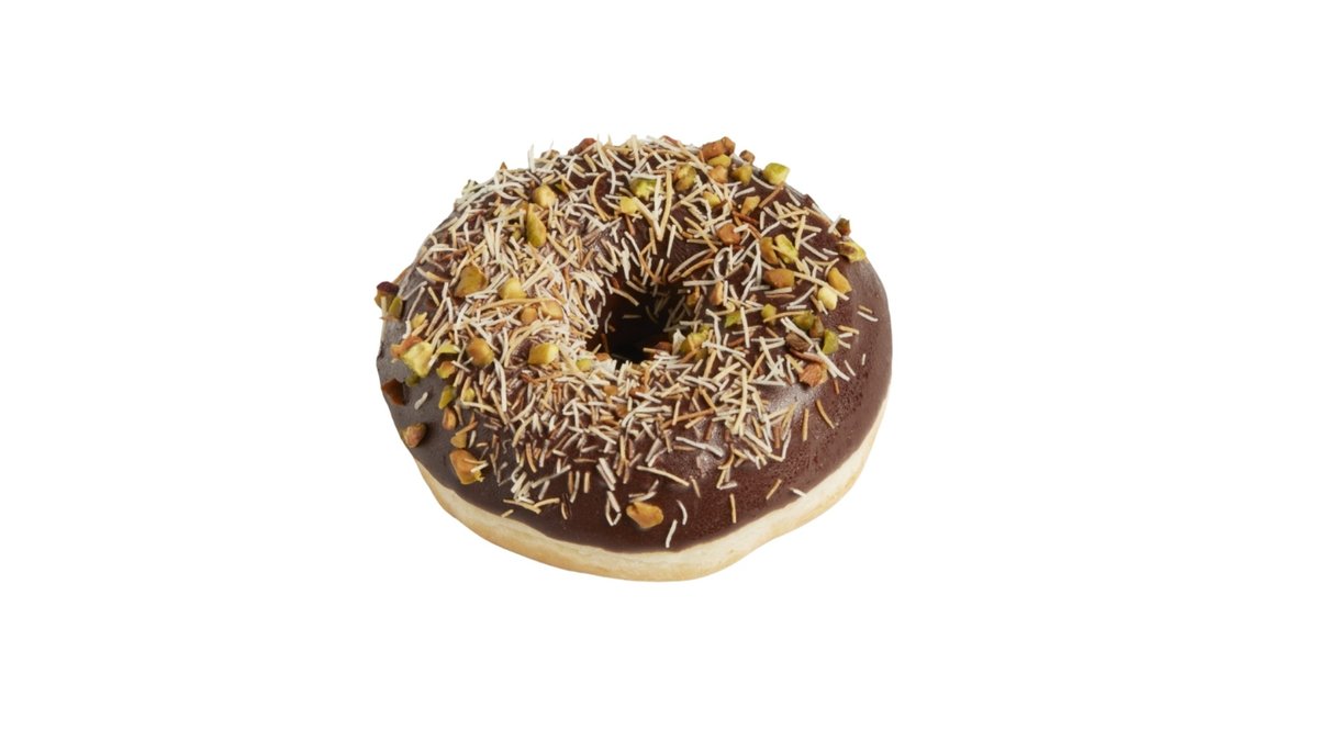 Dubai-suklaasta inspiraationsa saanut donitsi kätkee sisäänsä vihreän pistaasitäytteen. Pinnassa kaakaokuorrute sekä taikina-pistaasimuru.