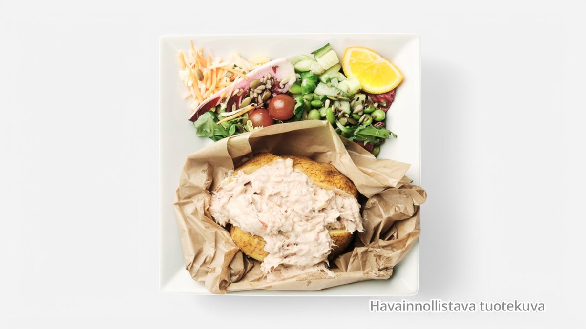 Uuniperunat, savulohi, feta, tillijogurttikastike