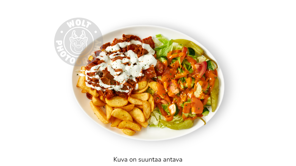 Broilerinsisäfile, falafel, riisi, ranskalaiset kebab liha, salaatti, salaattikastike, sekä tomaatti- ja valkosipulijogurttikastike.