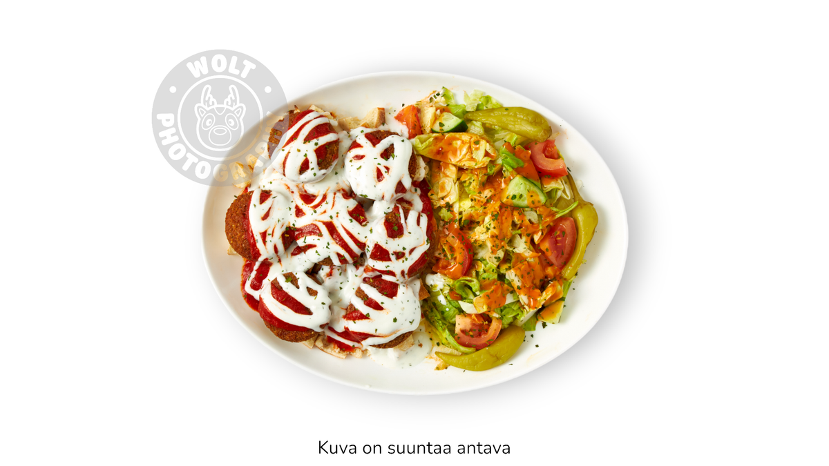 Annoksiin sisältyy: falafel, salaatti, sekä tomaatti- ja jogurttikastike
