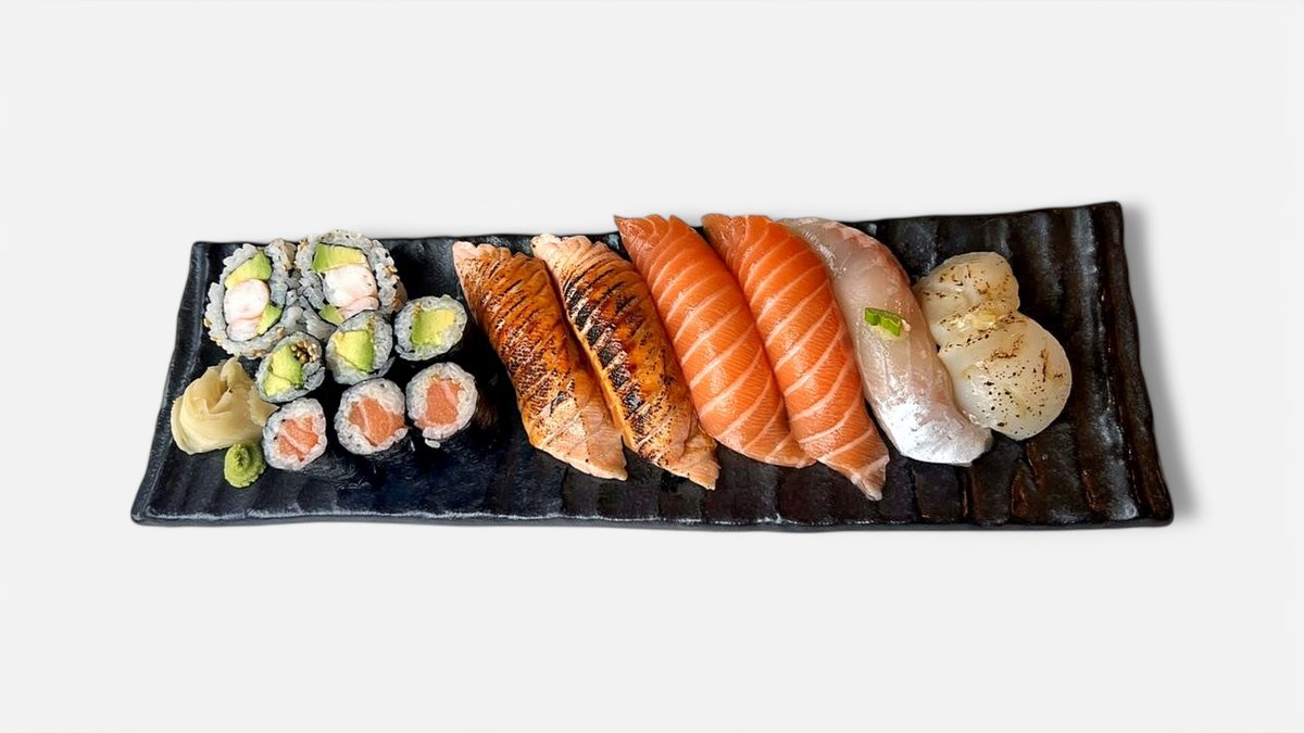 8 maki: 2x California, 3x Salmon Hosomaki, 3xAvocado Hosomaki. 6 nigiri: 2 grilled salmon, 2x Salmon, Scallop, Siika 1x Salmon Miso Soup