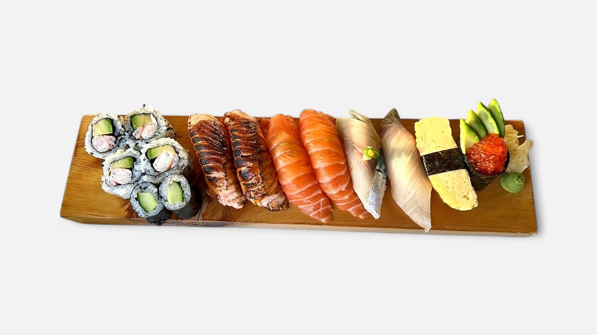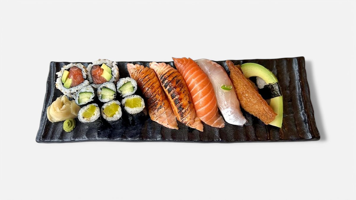 Classic maki: 4 California, 4 Salmon-Avocado, 4 Grilled Salmon, 4 Ebi Furai Hosomaki: 3 Salmon, 3 Avocado, 3 Cucumber, 3 Radish