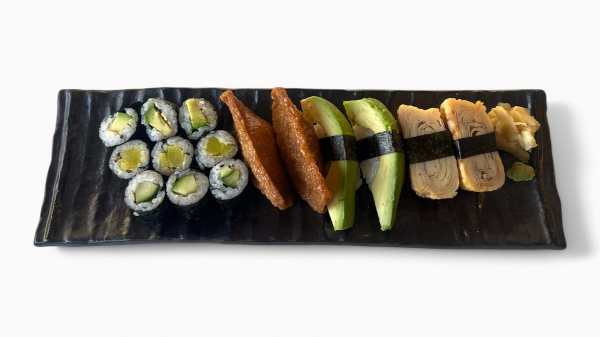 9 Hosomaki: 3 cucumber, 3 avocado, 3 pickled radish Nigiri: 2x Avocado nigiri, 2x Inari nigiri, 2x Tamago 1x Vegan miso soup