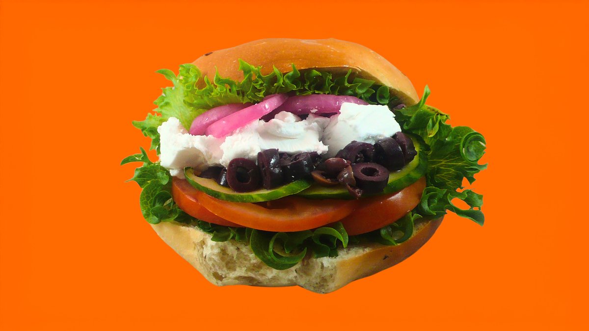 Vegan greek che*se, fresh tomatoes and cucumber, black olives, pickled red-onion, vegan mayo & crispy lettuce on a Round bagel