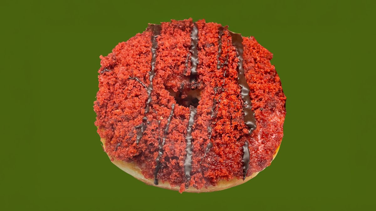 Sweet vanilla glazed donut topped with our homemade red velvet cake and chocolate drizzle