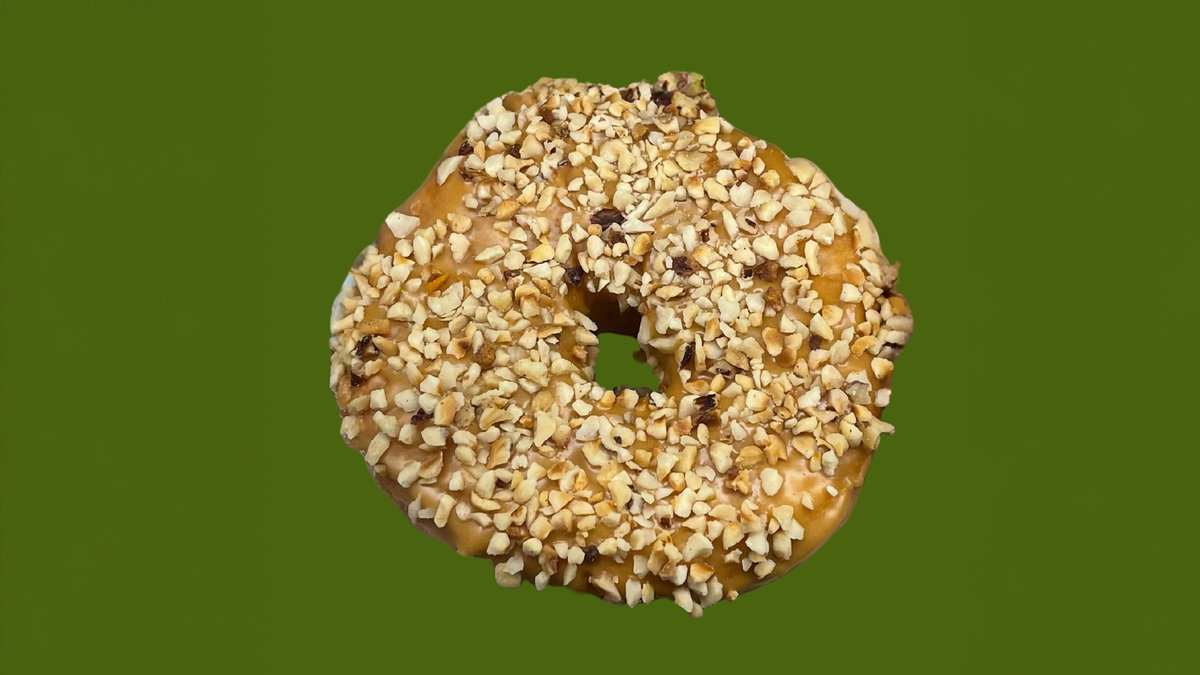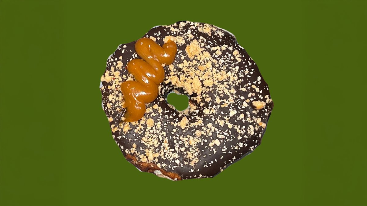 This donut - inspired by certain candy bar - is glazed with chocolate, dipped in crunchy peanut bits and topped with yummy caramel!