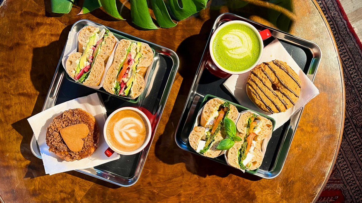 The meal includes a filled sandwich, drink and a delicious donut! Vegan Greek che*se, fresh cucumber and tomato, black olives, pickled red-onion, vegan mayo and crispy salad on a bagel