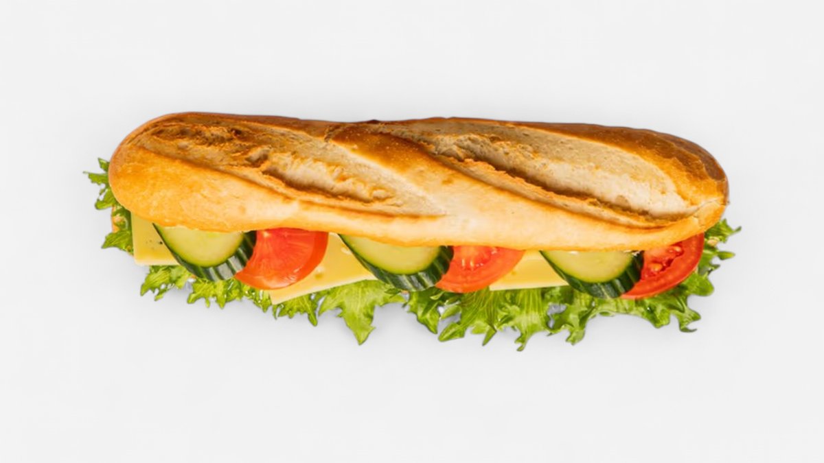 Vehnäpatonki, jonka täytteenä Emmental juustoa, kurkkua, tomaattia ja salaattia