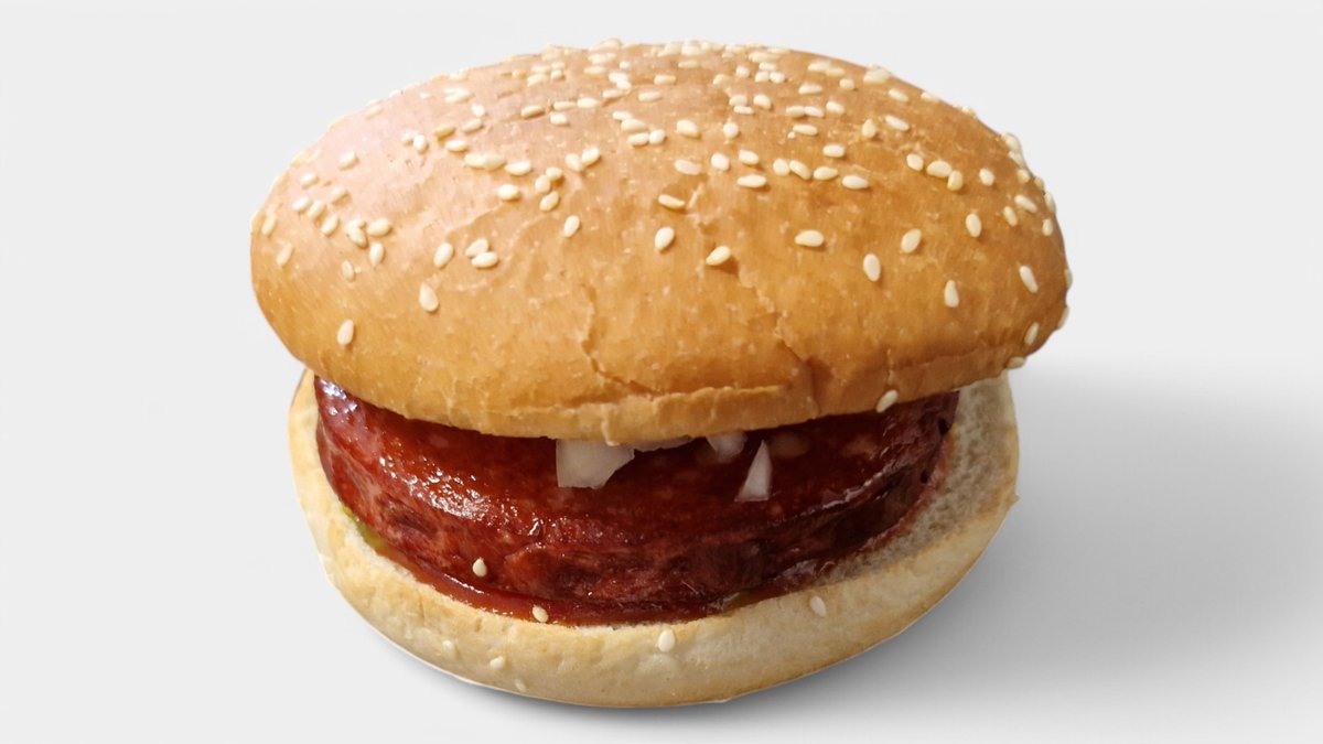 Jättisämpylä, sipuliteemakkara, 75g täyslihapihvi, hampurilaiskastike, salaatti, tomaatti, maustekurkkuviipale
