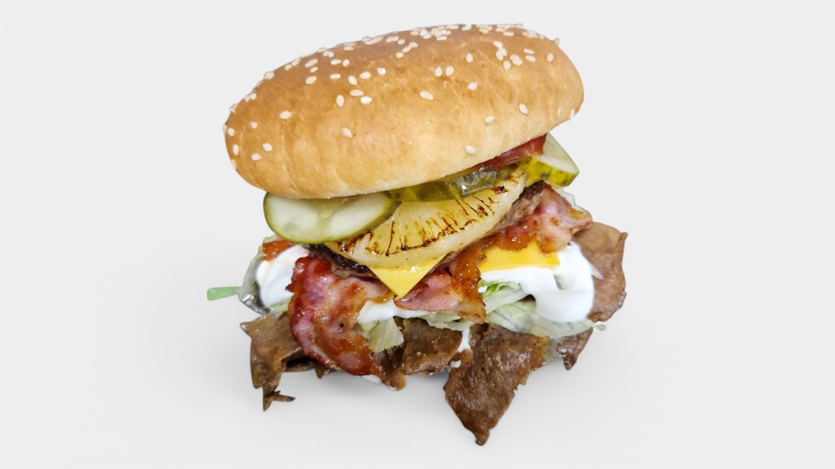 Jättisämpylä, 120g täyslihapihvi, kebabliha, valkosipulimajoneesi, salaatti, tomaatti, jogurttikastike, 2x cheddarjuusto, ananas, pekoni, maustekurkku, ketsuppi