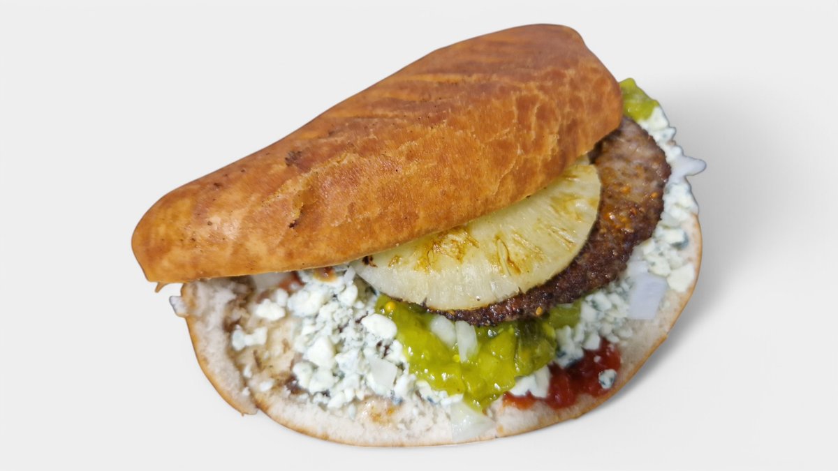 Jättisämpylä, 120g täyslihapihvi hampurilaiskastike, salaatti, tomaatti, ananas, aurajuusto, maustekurkku, ketsuppi