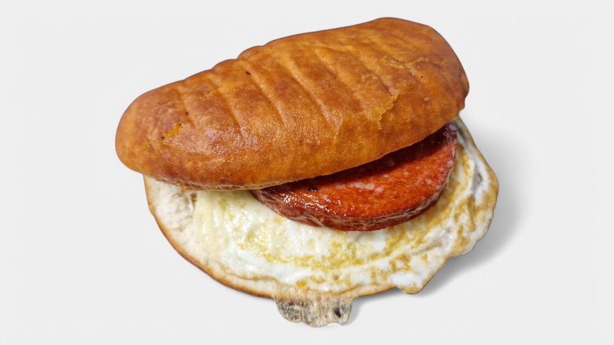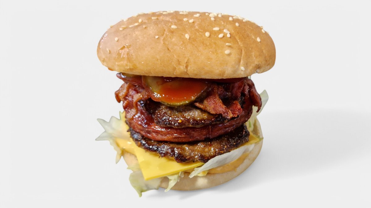 Jättisämpylä, 2x120g täyslihapihvi, hampurilaiskastike, salaatti, tomaatti, kananmuna, 2x cheddarjuusto, pekoni, maustekurkku, ketsuppi