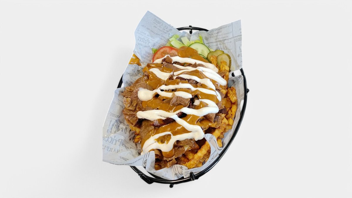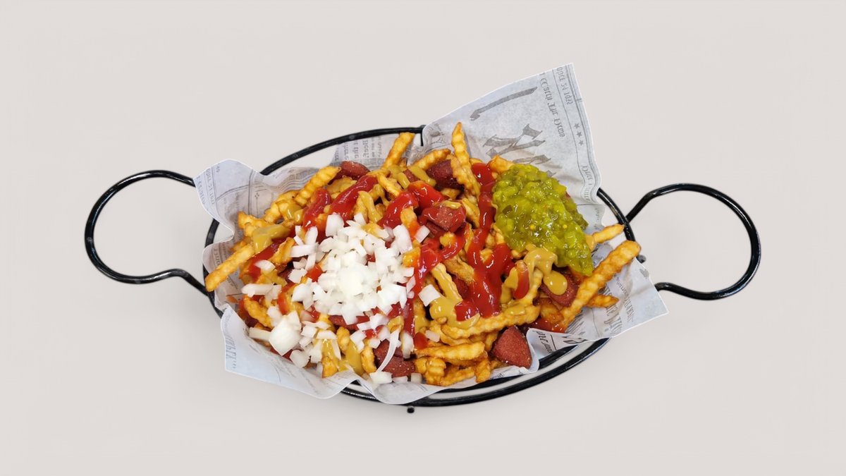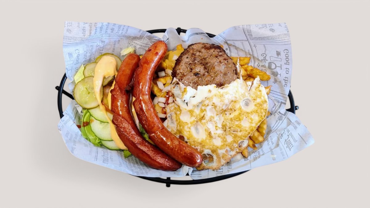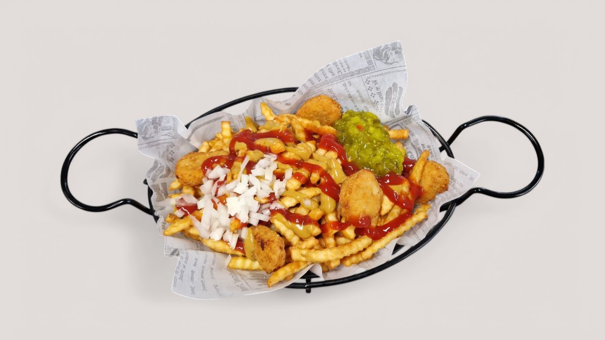 Tämän annoksen ovat suunnitelleet KJT Haukat U20 mestis joukkueen pelaajat kaudella 25-26. Sisältää ranskalaisia, lihapullia, pilkottuja Wotkin's sorkan nakkeja ja kaksi kananmunaa. Mausteina sinappi, ketsuppi, sipuli ja maustekurkkuviipale