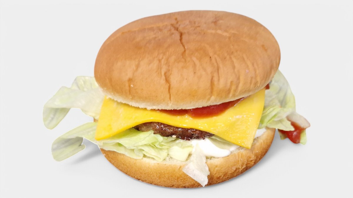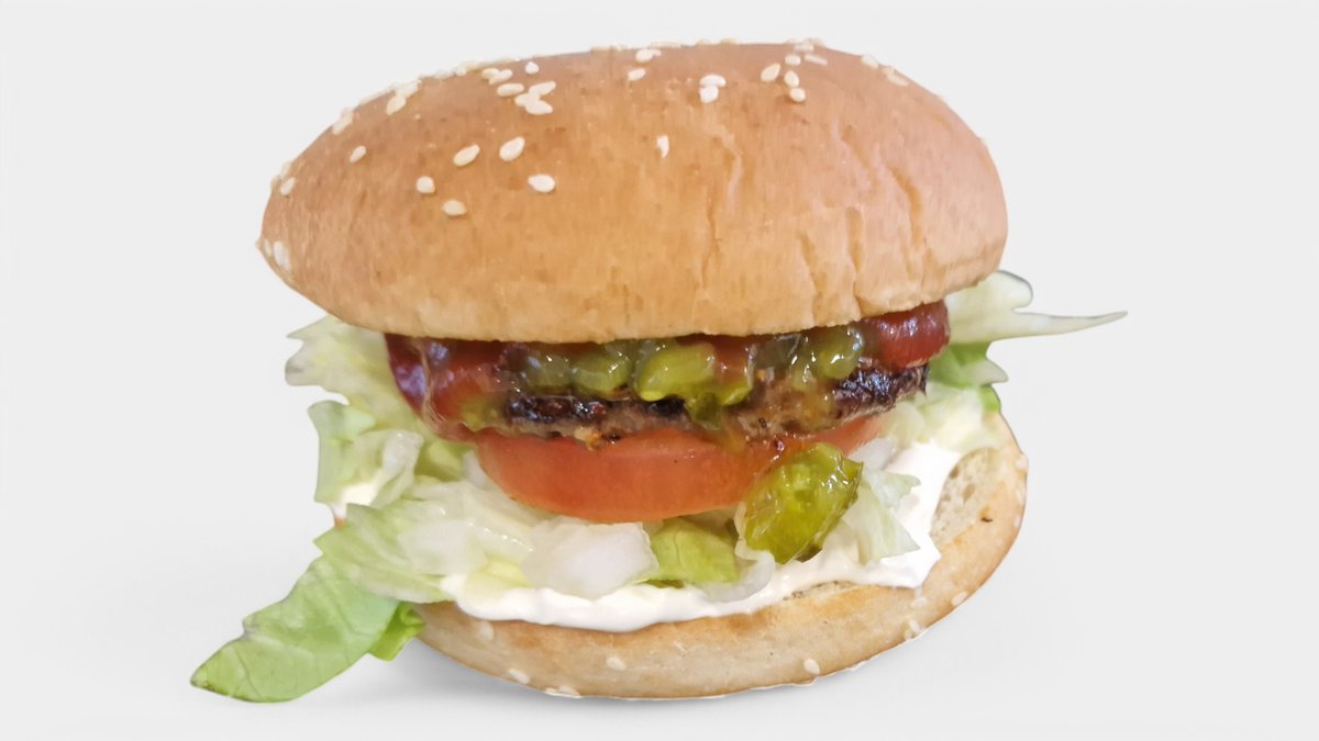Jättisämpylä, 75g täyslihapihvi, majoneesi, salaatti, tomaatti, kurkkusalaatti, sipuli, sinappi, ketsuppi