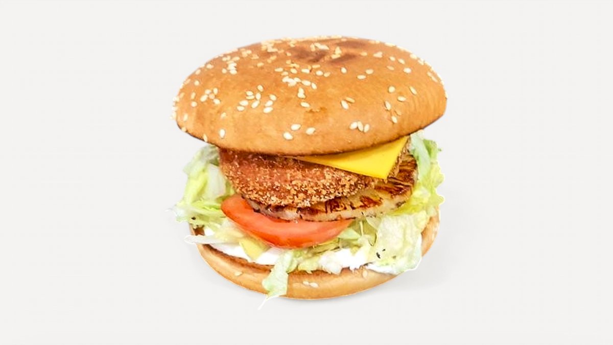 Jättisämpylä, paneroitu kanapihvi, majoneesi, salaatti, tomaatti, ananas, cheddarjuusto, maustekurkku, ketsuppi