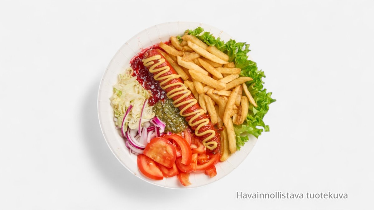 Kebab, makkaraherkku, sinappi, ketsuppi, kurkkusalaatti, sipuli, pekoni ja aurajuusto. Kebab annoksiin kuuluu; kastike vaihtoehto mieto-, tulinen-, ja valkosipuli. Annos sisältää 0,33l juoman.