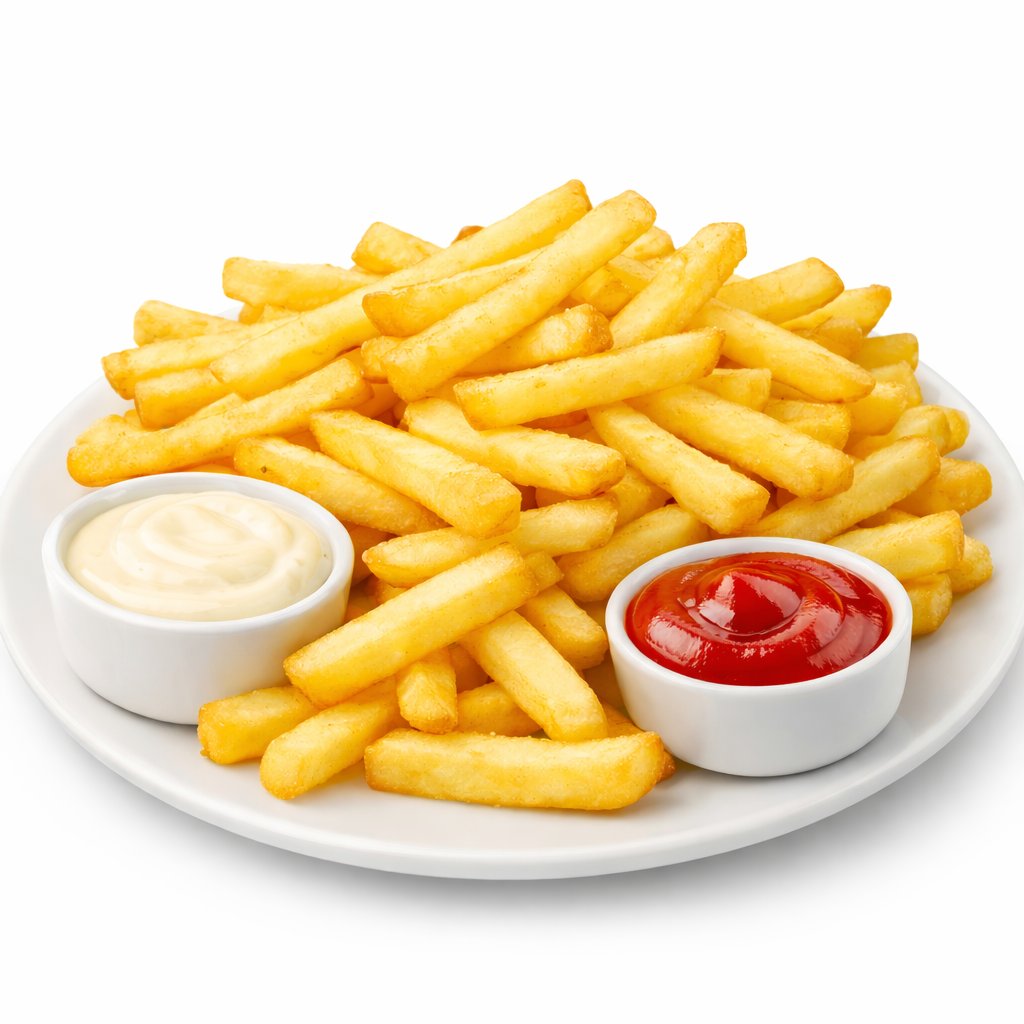 Kultaiset, täydellisesti paistetut perunaranskalaiset tarjoillaan kuumina ja rapeina, kermaisen valkosipulikastikkeen ja klassisen ketsupin kera dippaukseen.