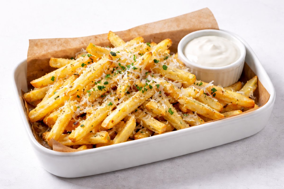 Kultaiset, rapeat ranskalaiset, runsaalla parmesaanijuustokuorrutteella ja tarjoillaan silkkisen klassisen valkosipulikastikkeemme kera. Yksinkertainen, herkullinen ja täydellinen lisä mihin tahansa ateriaan