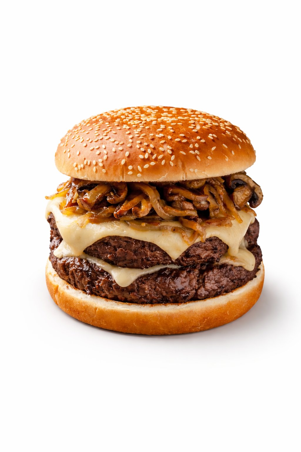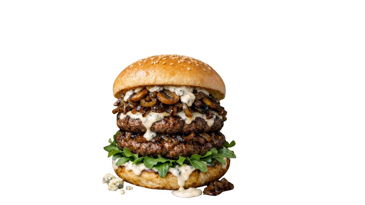 Kaksi naudanlihapihviä sulatetulla emmentaljuustolla, sienillä, karamellisoidulla sipulilla ja kermaisella talon majoneesilla. Tarjoillaan ranskalaisten perunoiden, valkosipulimajoneesin ja yhden 0,33 litran juoman kera.