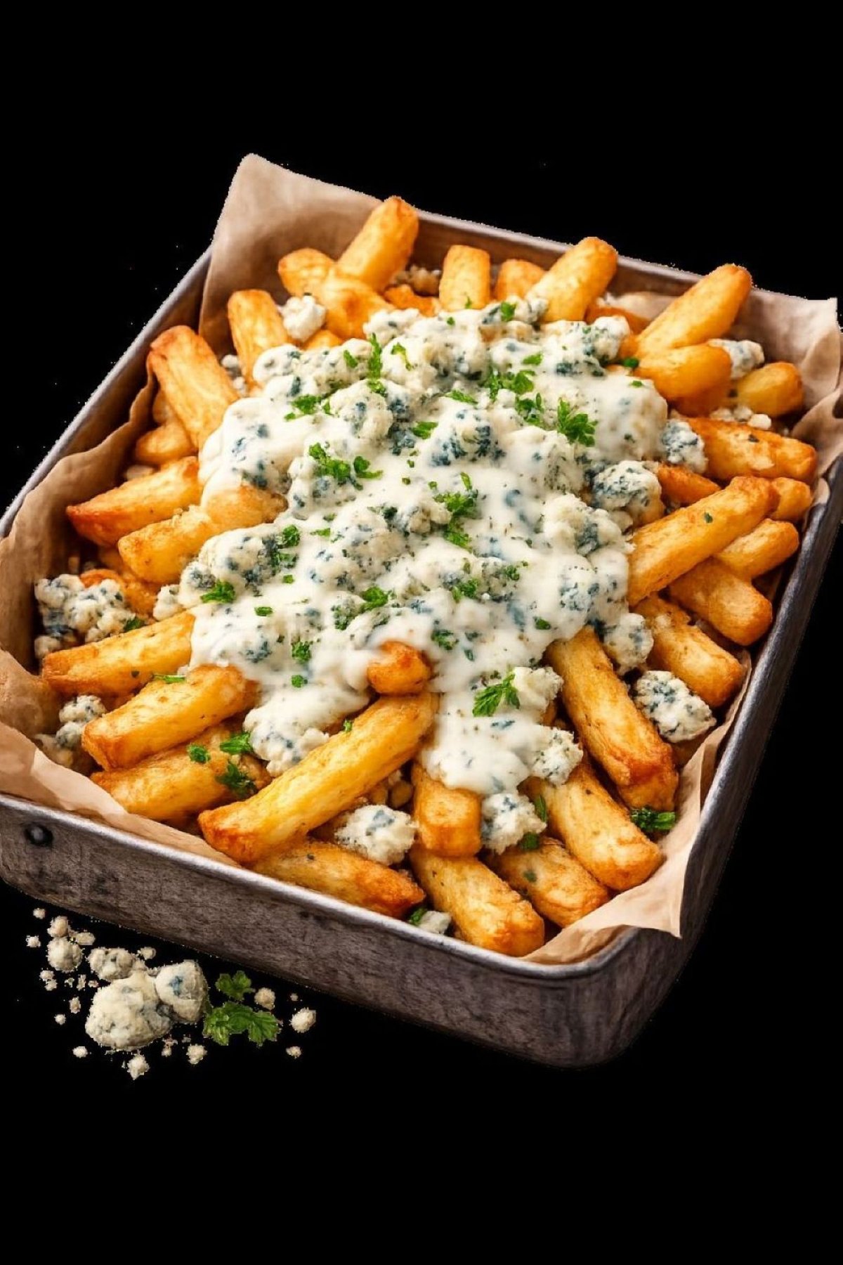 kullankeltaiset ranskalaiset kruunattuna täyteläisellä sinihomejuustokastikkeella ja viimeistelty kevyellä persiljalla. Tarjoillaan valkosipulimajoneesin ja ketsupin kanssa.