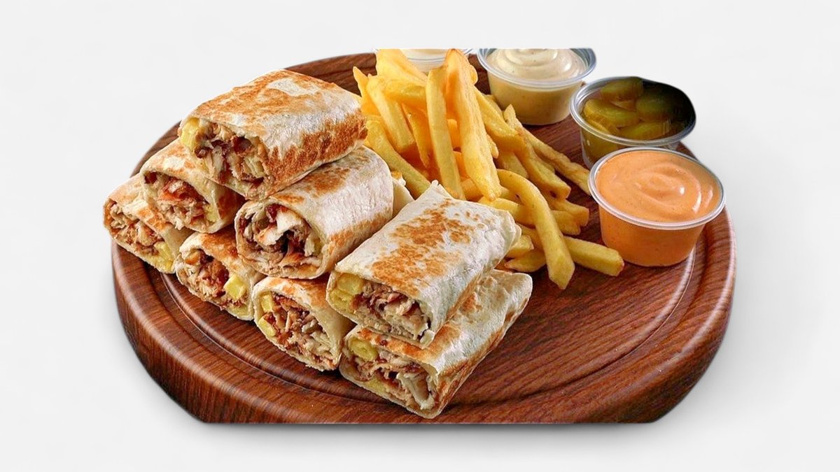 40cm tortilla , Grillattu (paprika, herkkusieni ja maissi), kanakebeb, ranskalaiset, valkosipulimajoneesi ja currymajoneesi. (Ja valkosipuli ja ketsuppi dippi) . 0.33juoma