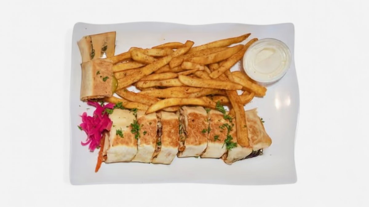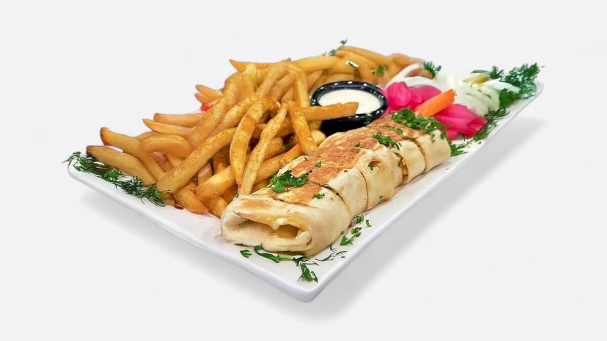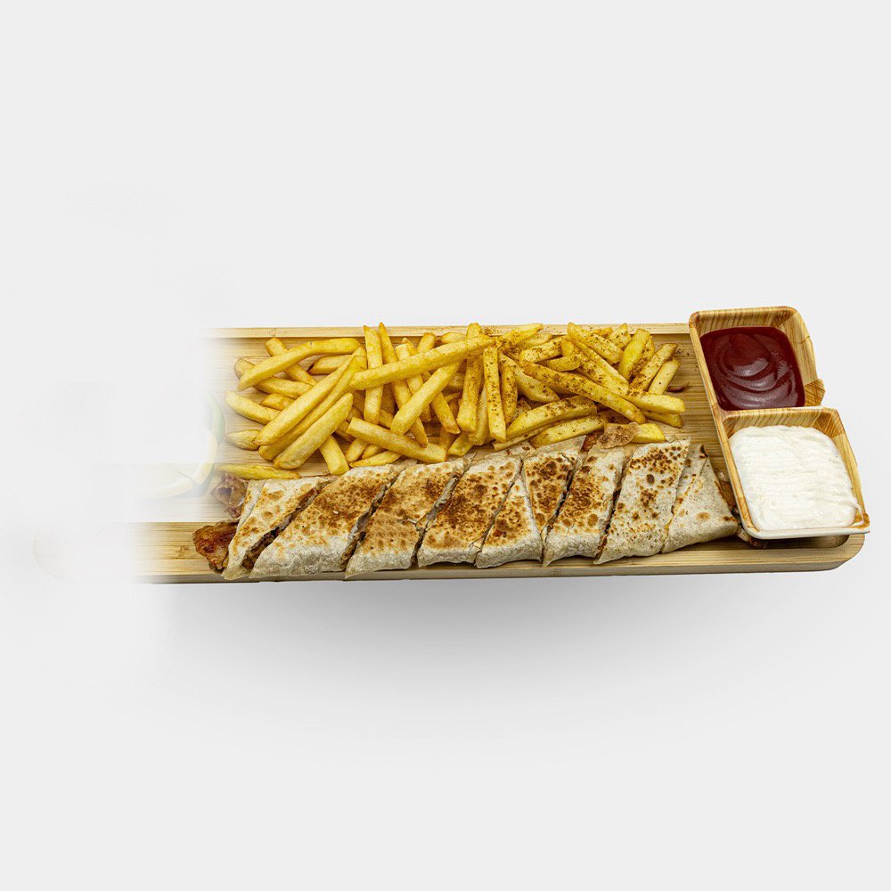 40cm tortilla, (Grillattu kebab, kebabkastike) ranskalaiset , paprika, aurajuusto valkosipulimajoneesi, BBQ-majoneesi. Ketsuppi dippi . 0.33juoma