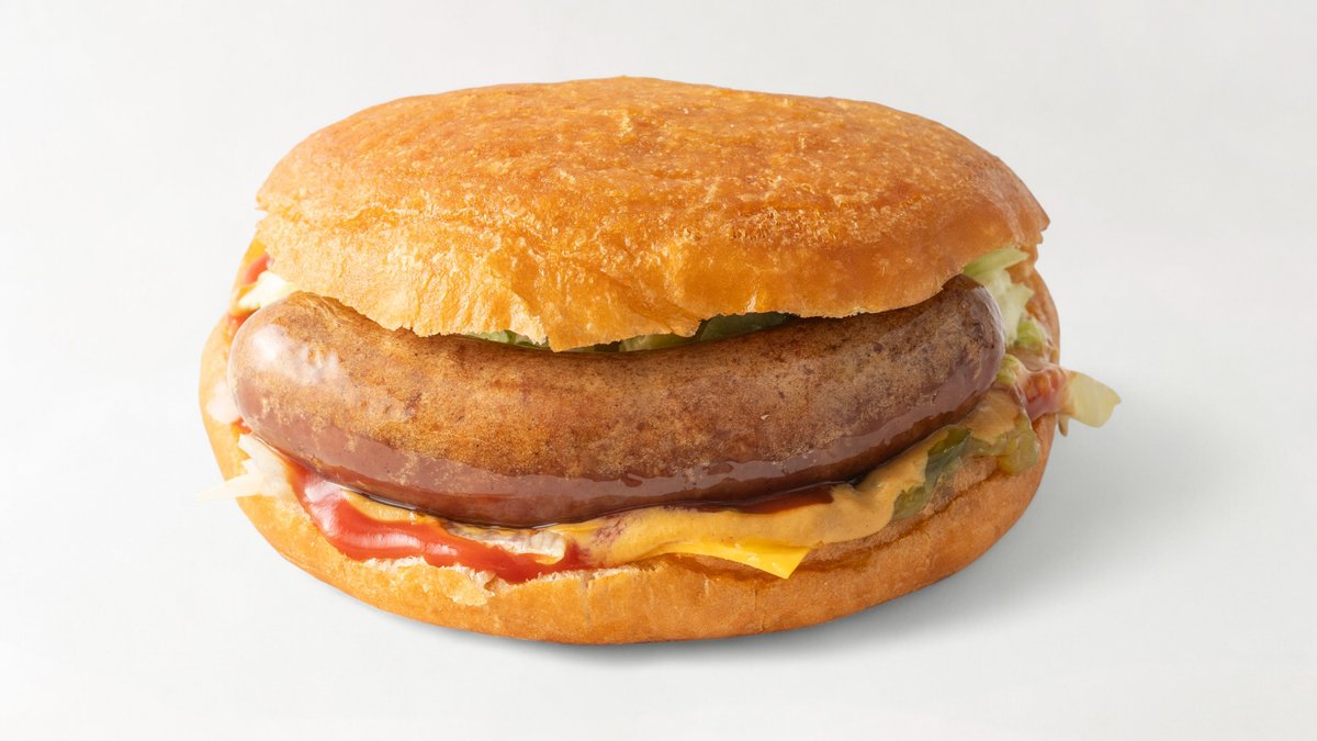 100g täyslihapihvi, berliinimakkara, kananmuna, cheddarjuustoa sinappi, ketsuppi, sipuli, kurkkusalaatti, salaatti, amerikankastike