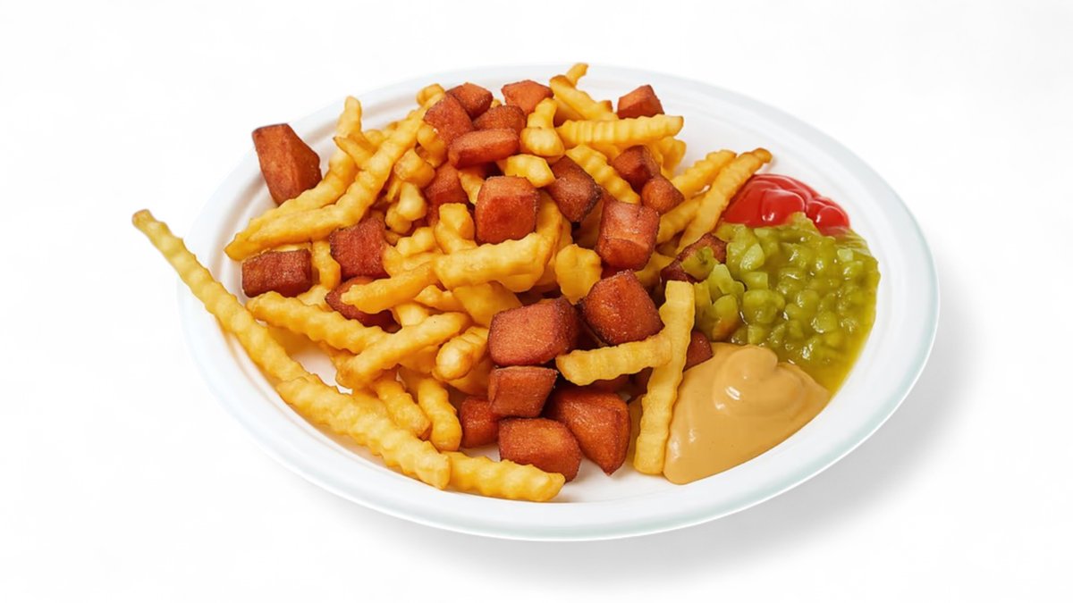 Ranskalaiset, berliinimakkara,100g täyslihapihvi, kananmuna, sinappi, ketsuppi, sipuli, kurkkusalaatti