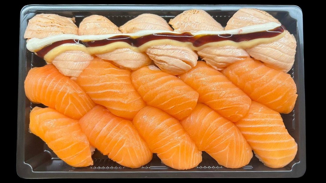 Grillattu lohi nigiri 8kpl, Tonnikala nigiri 4kpl, Avokado nigiri 4kpl, Surimi maki 4kpl, Lohi maki 4 kpl