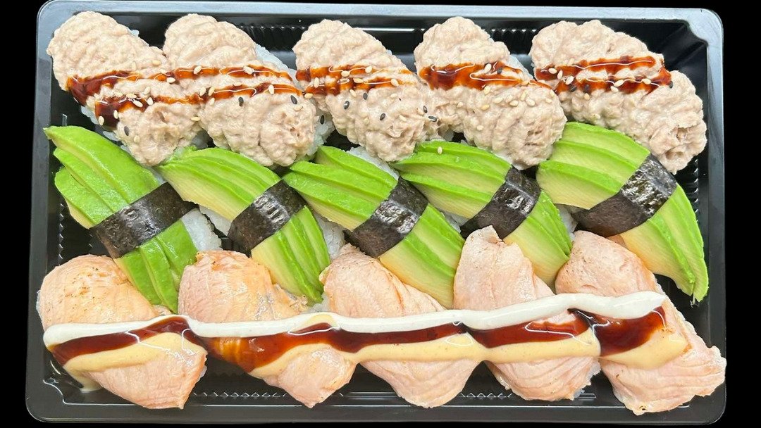Tonnikala nigiri 5kpl, Avokado nigiri 5kpl, Lohi nigiri 5kpl