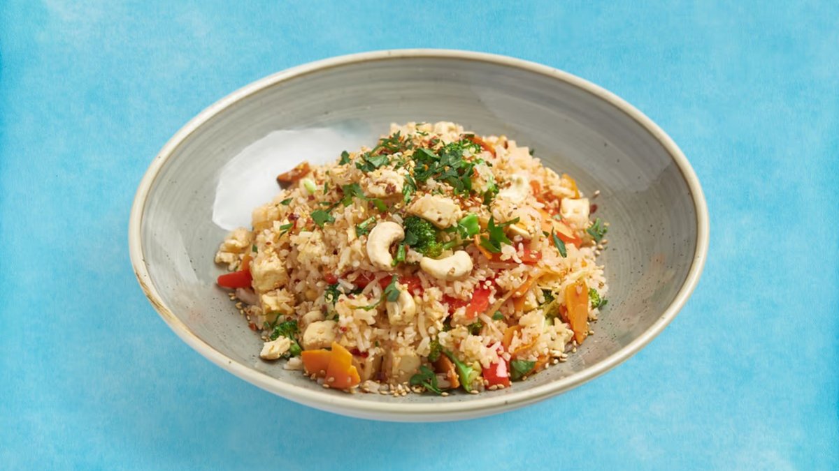 Vaaleariisi, tofu, parsakaali, paprika, cashewpähkinä, seesamiöljy, ripaus chiliä ja valkosipulia