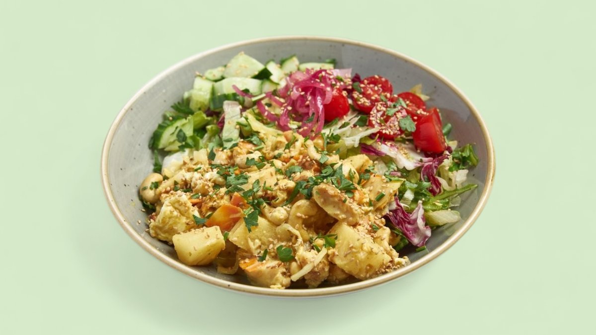 Salaatti, kana, ananas, cashewpähkinä ja kormakastike