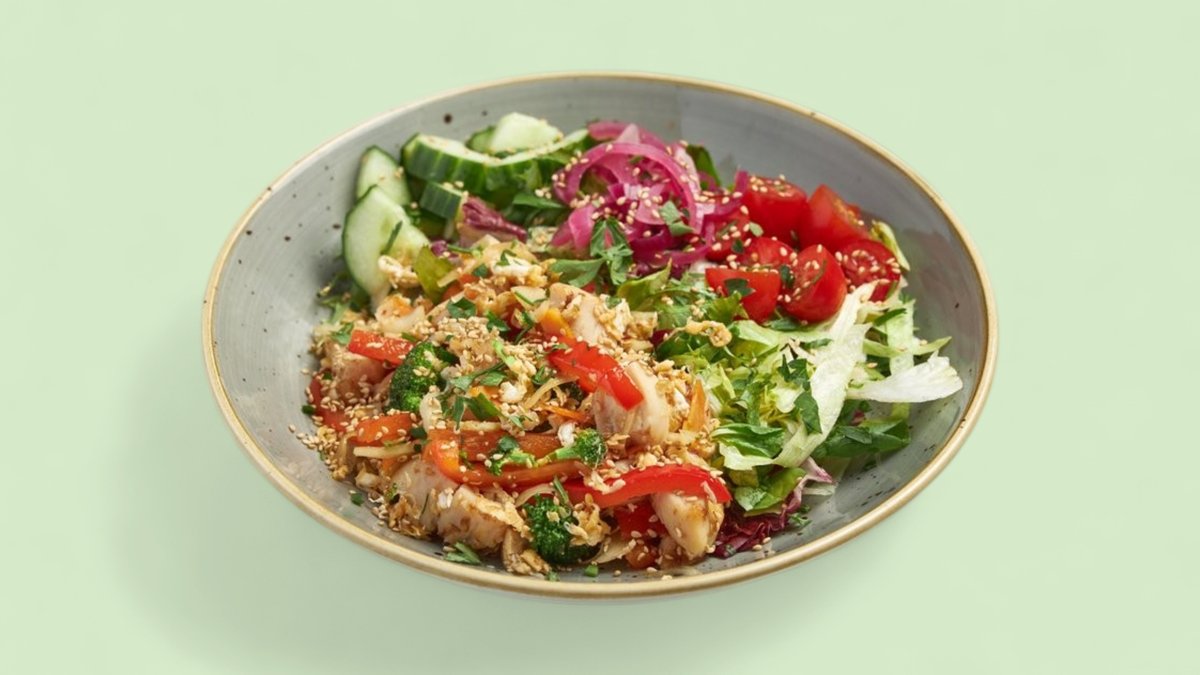 Salaatti, kana, parsakaali, paprika ja sweetchilikastike