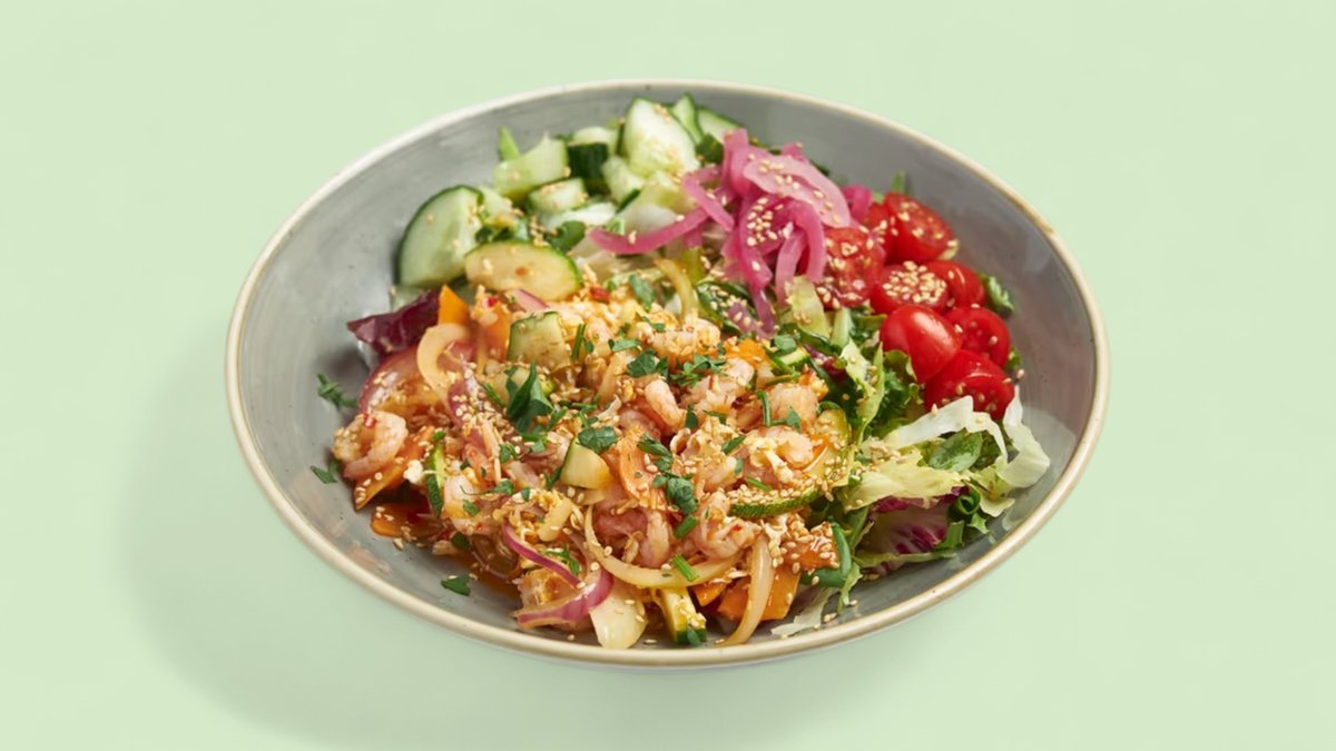 Salaatti, katkarapu, sipuli, kesäkurpitsa ja chili-limekastike