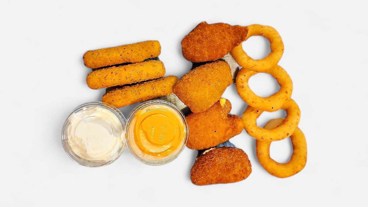 100g paistettu kananpihvi, 4×kananugetti, ranskalaiset, valitsemasi 0.33l juomaa, valitsemasi dippi