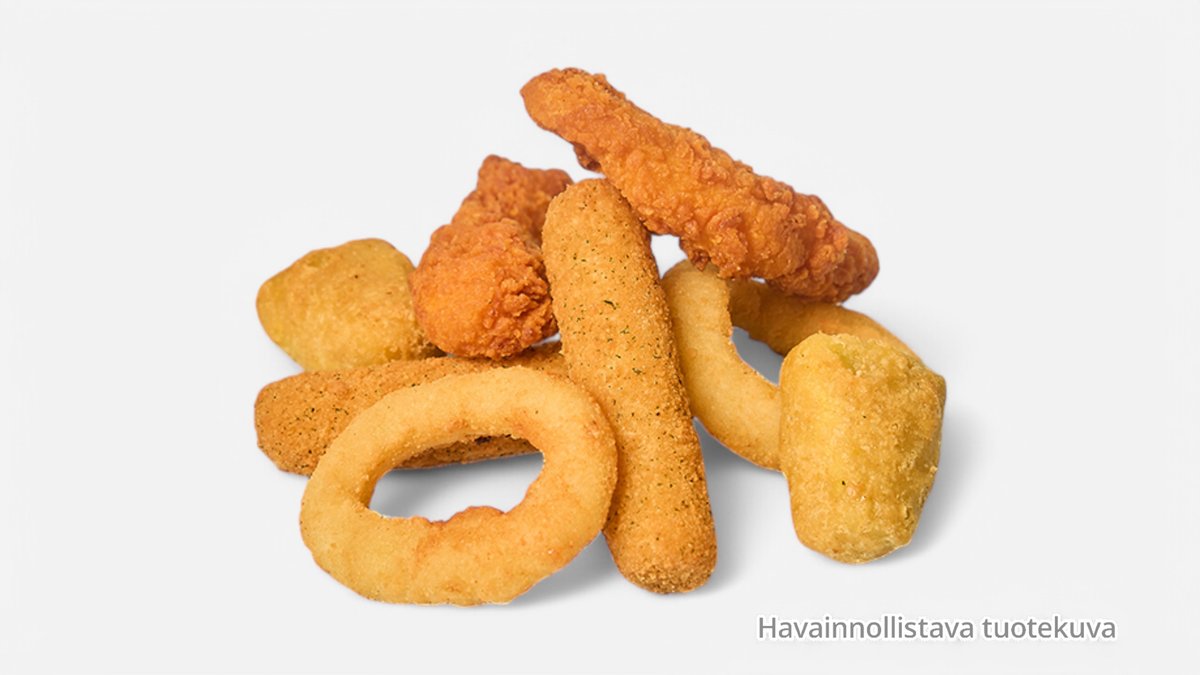 2 X juustotikku, 2 x chili-chesee, 2 x sipulirengas, 2 x cheddar jalapeno, 2 x nachokolmio, 2 x chickenwings, 2 x nugetti, 2 x dippi + ranskalaiset, salaattia, tomaattia, kurkkua, sipulia