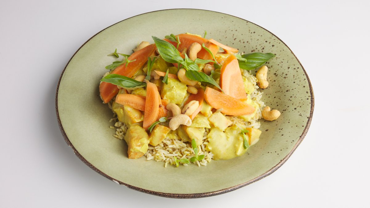 Chili sin carnea pavuilla, avokado-hernedippiä, basmatiriisiä, suolapähkinää ja korianteria (v, g)